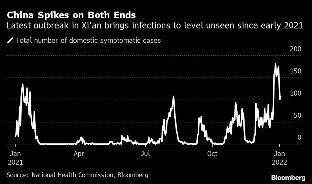 More than 100 people have been diagnosed daily for the past 10 days, a stark departure in China where the zero-tolerance Covid policy led to few locally transmitted infections throughout much of 2021. The deteriorating situation is putting officials under increased pressure as Lunar New Year, the country’s most important holiday and its busiest travel season, is looming, and Beijing is set to host the winter Olympics starting in February.