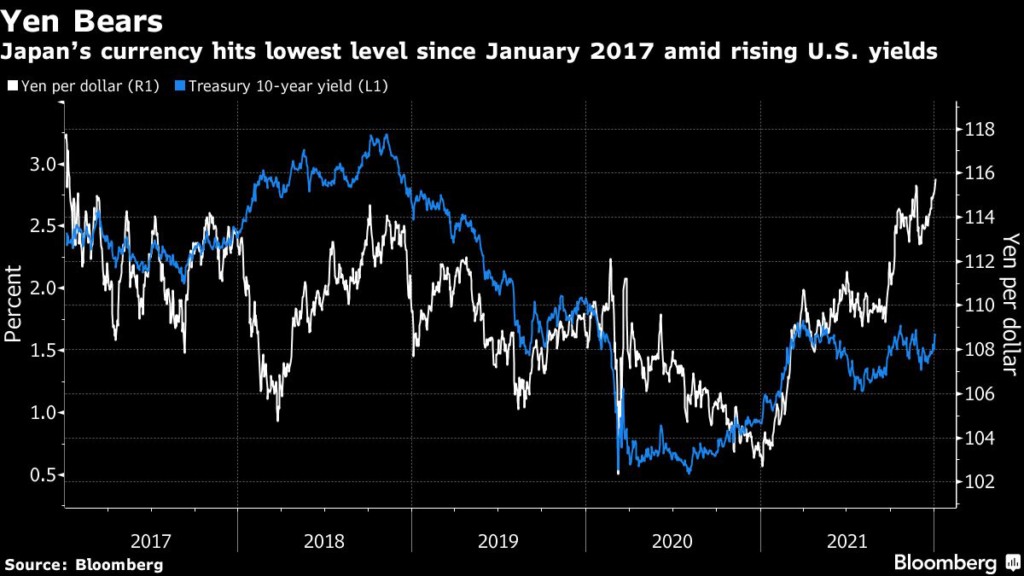 Benchmark Treasury yields steadied after climbing across the curve. The yield on the 10-year note topped 1.60% in its worst start to a year since 2009 as investors braced for Federal Reserve interest-rate hikes in 2022. The yen slid against all its Group-of-10 peers and declined to as low as 115.82 against the dollar.