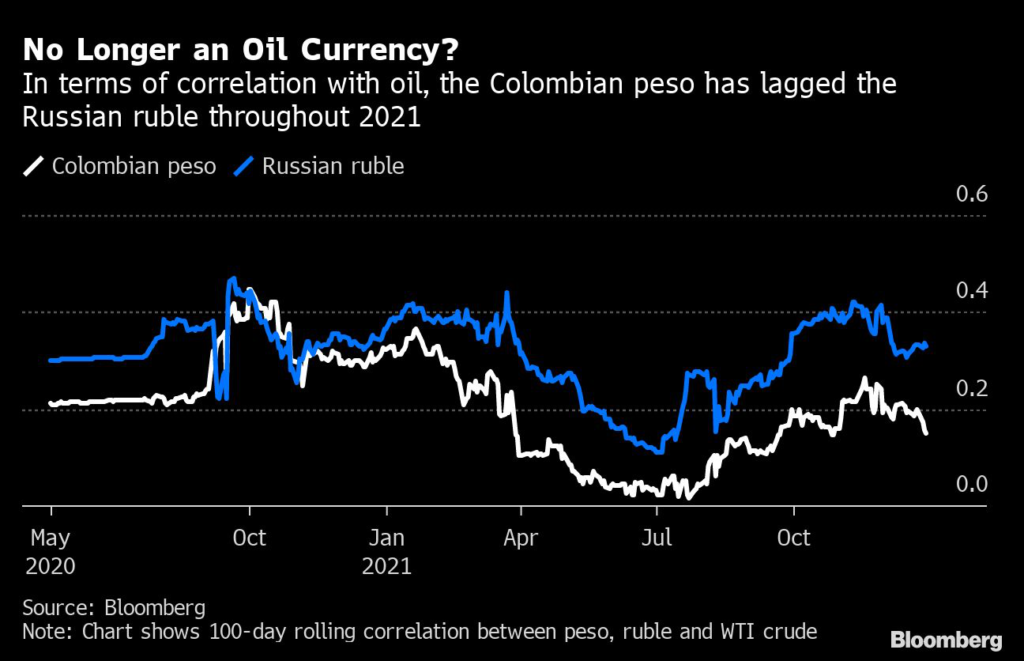 Oil leaped more than 50% in 2021, helping the Russian ruble hold steady, while doing little for the peso. As a result, the 100-day rolling correlation between the ruble and oil is now more than double that of the peso.