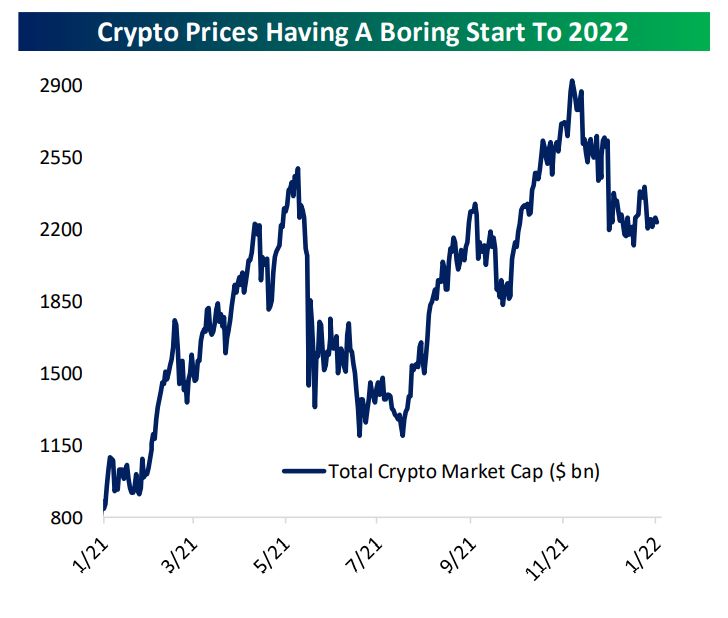 Digital assets have been making a series of lower lows and lower highs since reaching a peak in market value of about $3 trillion in November. In aggregate, prices are flat over the last seven months and while changes at the start of 2022 aren’t dramatic by historical standards, “the most interesting outcome for price action this year would be lower volatility, regardless of the size of gains or losses in either direction,” wrote analysts at Bespoke Investment Group.