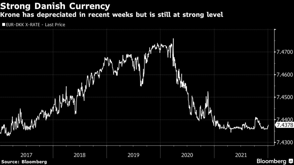 The bank uses currency interventions to steer the krone in a tight band to the euro and changes its interest rates when those interventions become too great. Its benchmark deposit rate is already at minus 0.6%. Denmark has had negative rates longer than any other country.