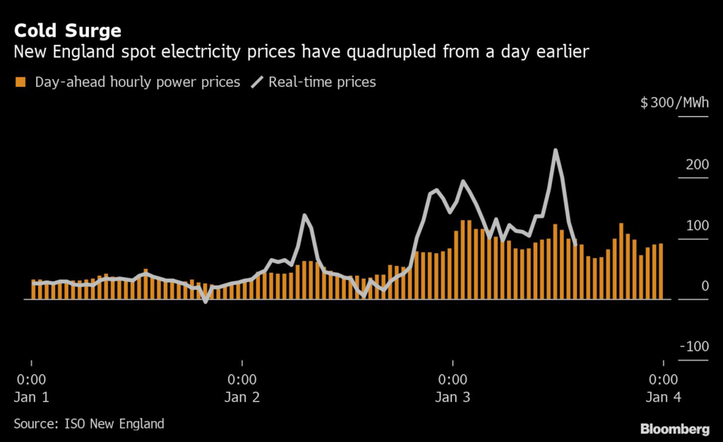(Bloomberg) — Electricity prices in New England jumped on Tuesday as a frigid start to the day spurred demand when the cost of natural gas used to fuel power plants soared.