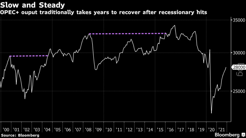 Things are moving faster this time. On Tuesday, OPEC+ agreed to hike output by 400,000 barrels per day. It has resumed two-thirds of the production that was halted when the pandemic hit in 2020, and the rest is expected by the middle of this year, according to the current schedule. That would put this post-recession recovery at about two years.