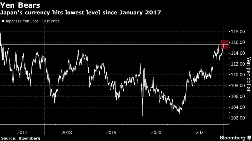 (Bloomberg) — The yen fell to its weakest level against the dollar in five years, as global growth optimism triggered a spike in U.S. Treasury yields and undermined the appeal of safe haven assets.