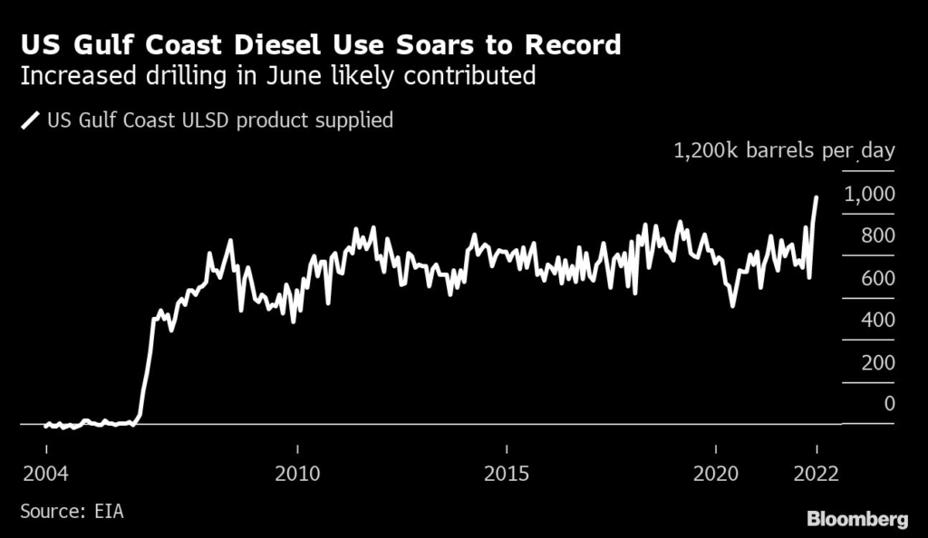 US diesel supplied — a proxy for demand — hit a seasonal record in June, according to monthly estimates from the US Energy Information Administration this week. On the Gulf Coast, June diesel use surged to an all-time high, the data show.
