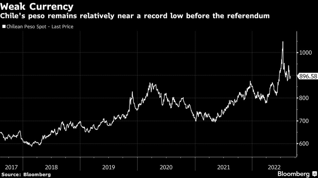 Investors see the rejection of the new charter as giving a boost to local markets. While LarrainVial says the peso could strengthen beyond 850 per dollar and the IPSA stock exchange could top 6,300 if the document is voted down, local fixed-income analysts surveyed by Bloomberg see opportunities in lower rated corporate debt or long-dated sovereigns.