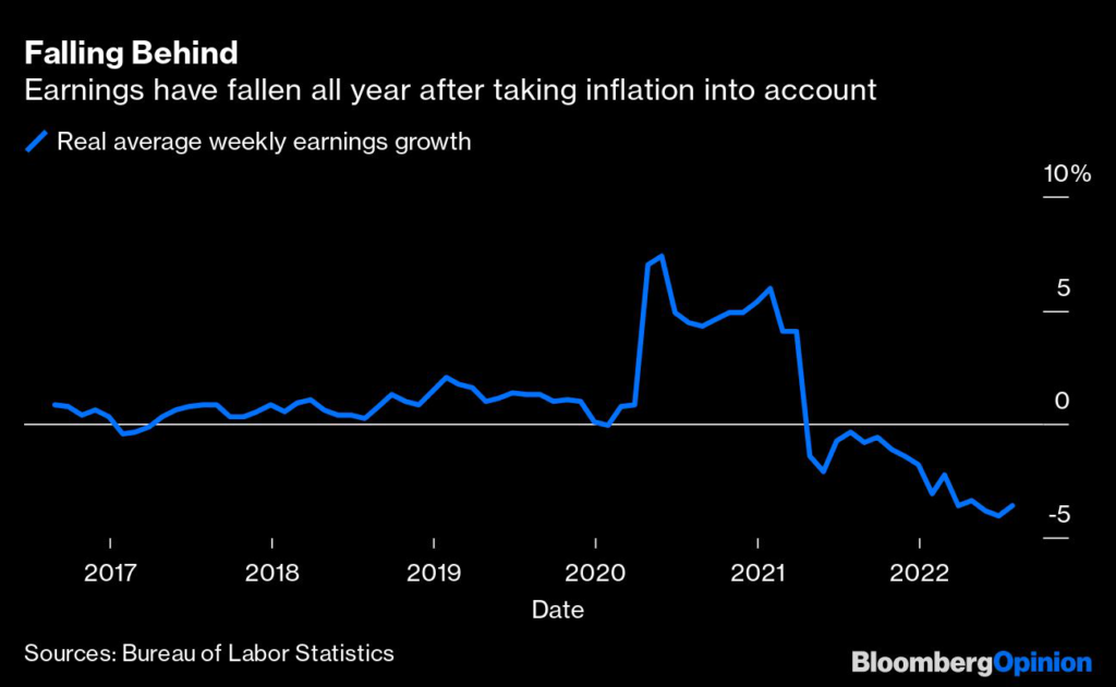 Pero corregidos por la inflación, los salarios reales han disminuido todos los meses desde entonces, lo que lleva la caída acumulada al 3,2%. Incluso el crecimiento de los salarios nominales está decayendo: la tasa de crecimiento anual, que era del 5,6% en marzo, se desaceleró al 5,2% en julio. Cuando se incluyen otras fuentes de ingreso personal (beneficios de los empleados, ingresos de propiedad, alquileres, intereses, dividendos y beneficios del Gobierno) y se restan los impuestos sobre la renta, el ingreso personal disponible aumentó un 6,8% en el segundo trimestre respecto del año anterior, pero cayó un 0,6% si se ajusta por inflación.