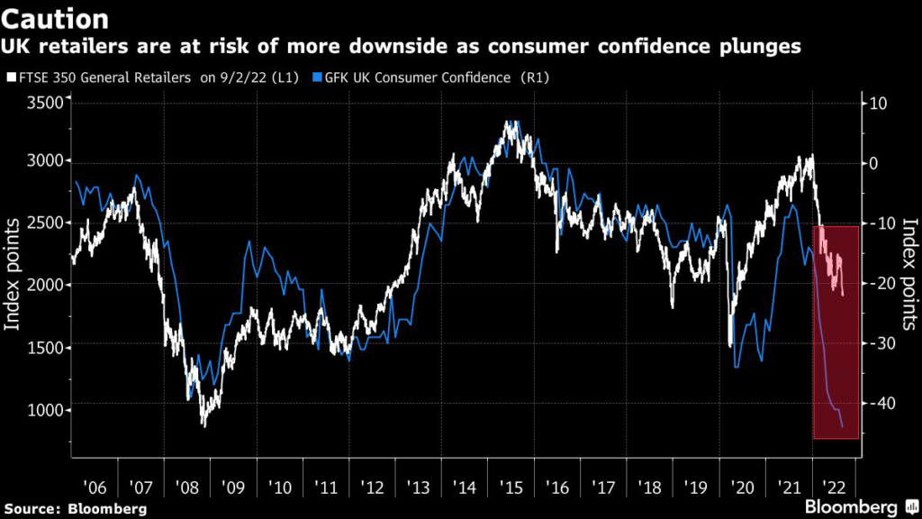 Companies like Persimmon Plc and Barratt Developments Plc have seen their market values cut in half this year as the Bank of England kicked off a program of rate hikes to combat inflation, while the FTSE 350 Retailers Index has sunk about 35%, reflecting Britons’ shrinking disposable incomes.