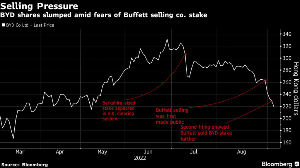 The Chinese automaker’s stock dropped as much as 6.8% to the lowest level since May 10 in Hong Kong. The selloff extended the shares’ losses to more than 18% since Berkshire’s stake sale was first made public on Aug. 30.