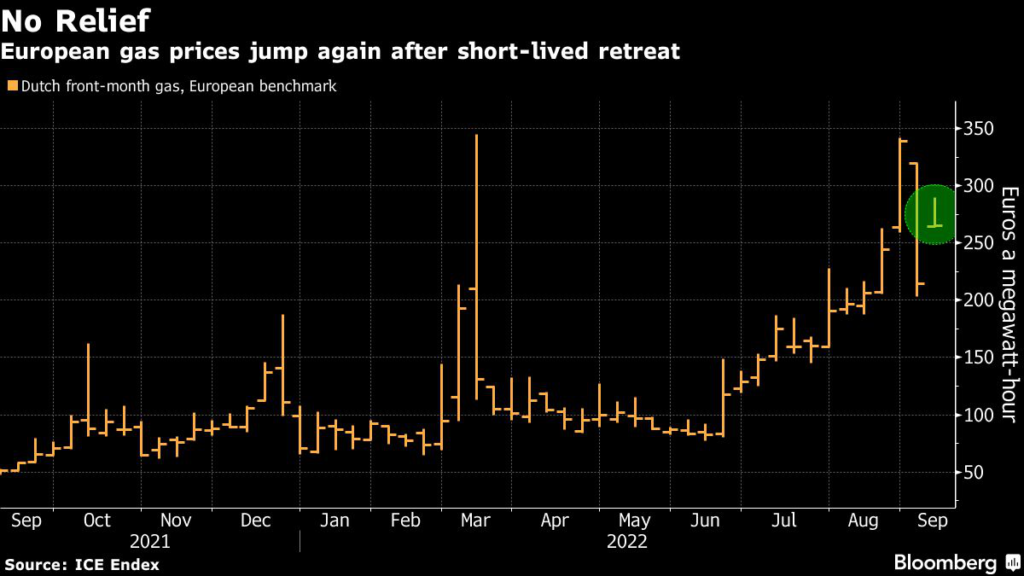 “Given the gas supply tightness, one cannot exclude mandatory gas curtailment for non-essential industries or even ‘rolling gasouts’ this winter depending on the weather,” analysts at JPMorgan said in a note. Goldman Sachs predicted that European prices could approach the highs set in August after Russia’s move.