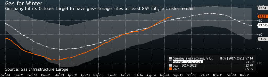 Swelling gas inventories in Germany and fellow European Union states had been a relief to the market, raising hopes the continent could build a working buffer for this winter. Germany’s gas storage sites are almost 86% full, just ahead of its intermediate target of 85% by Oct. 1.