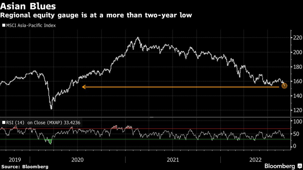 The next rate rise is due in Australia, where economists expect the central bank to lift the policy rate by a further 50 basis points. Tightening financial conditions globally are weighing on stocks and bonds — an Asia-Pacific equity gauge is at a more than two-year low — and stoking demand for the dollar as a haven.