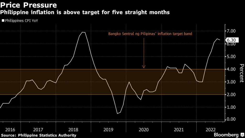 (Bloomberg) — Philippines’ headline inflation remained well above the central bank’s target in August, strengthening the case for policy makers to continue raising interest rates when they meet later this month.