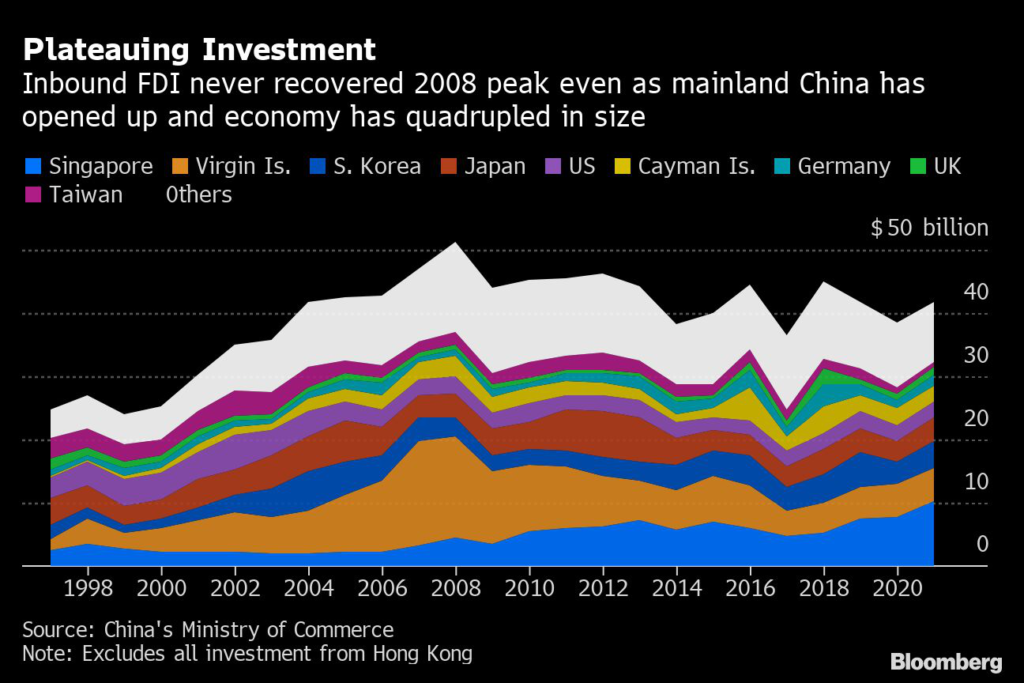 There is no detailed breakdown available yet for the origin of investment flows this year, but in 2021 new investment from everywhere but Hong Kong grew 8% to $42 billion, after dropping in 2019 and 2020. Inflows from Taiwan, Canada, Australia and the Cayman Islands shrank last year.