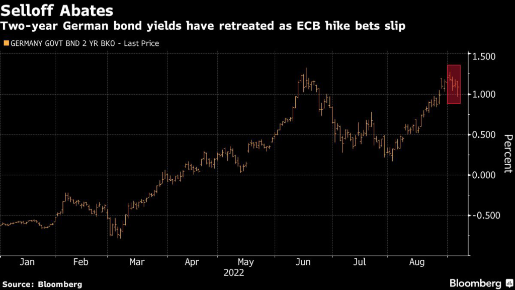 Money markets scaled back rate hike expectations, putting the odds of a 75 basis-point move at about 65%, according to swaps tied to ECB meetings. That’s down from as high as 80% last week. Data Tuesday showed factory orders in Europe’s largest economy fell for a sixth month, adding to concerns over the outlook for growth.