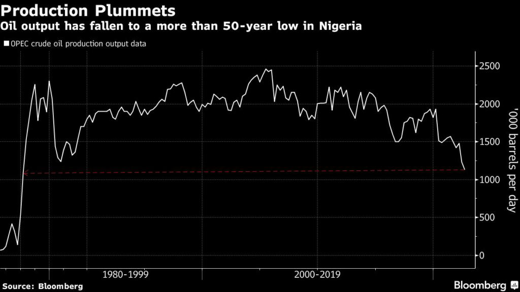 Average daily crude production in Nigeria fell to about 1.2 million barrels in July from about 1.9 million barrels as the Covid-19 pandemic struck in the first quarter of 2020, according to data compiled by Bloomberg. The unfolding collapse has left the country unable to meet its OPEC+ quota or to benefit from high oil prices.