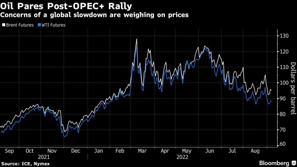 Crude has slumped since early June, erasing all of the gains made after Russia invaded Ukraine, as signs of a global slowdown and tighter monetary policy threatened to sap energy demand. A rise in the dollar also hurt prices. That decline prompted OPEC+ to pivot to removing barrels from the global market, switching tack from restoring the supply cuts imposed during the pandemic.
