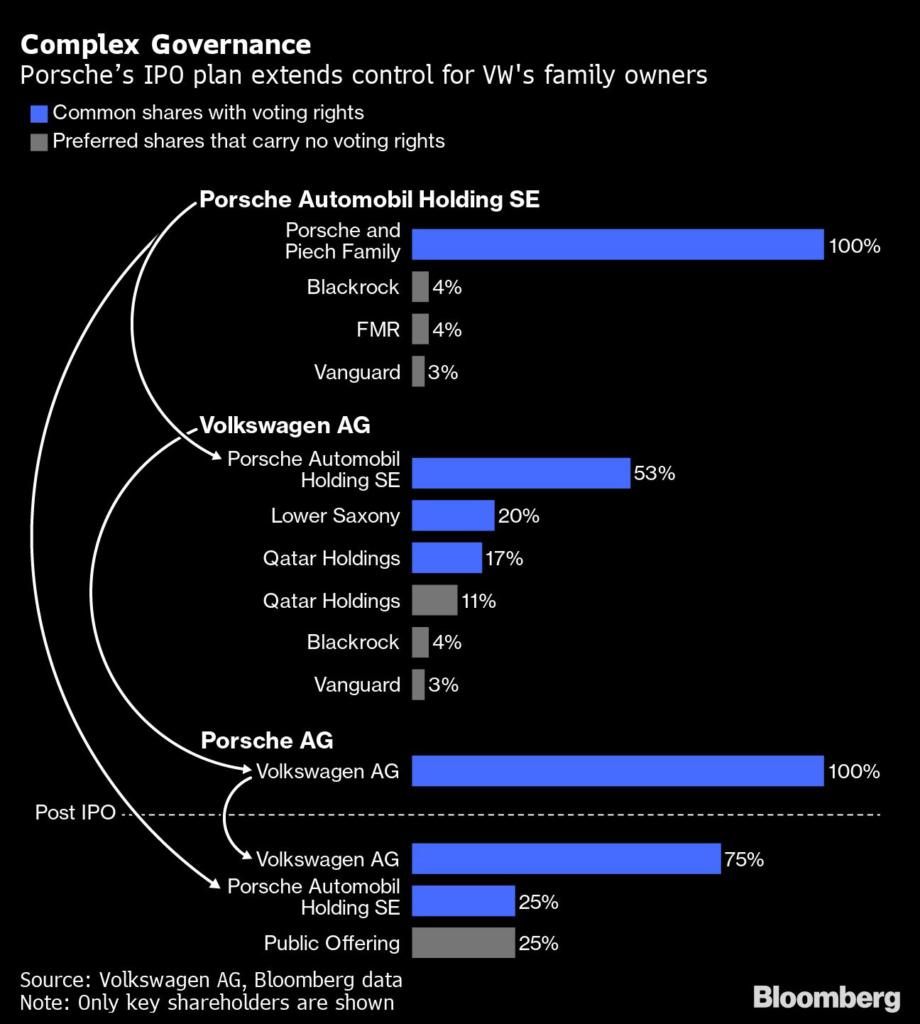 Investors will be able to purchase preferred shares in Porsche that don’t carry voting rights, while the family, which holds a 53% voting stake in Volkswagen through its investment firm Porsche Automobil Holding, is set to buy a blocking minority stake of 25% plus one share. The remaining voting stock will stay with Volkswagen.
