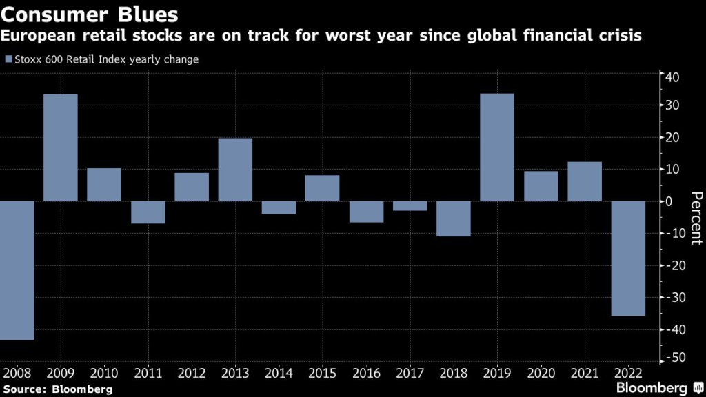 However, even with the rally, retail remains the worst performing subgroup in Europe’s benchmark Stoxx 600 Index this year, plunging 36% so far in 2022 and on track for its biggest annual decline since the global financial crisis.