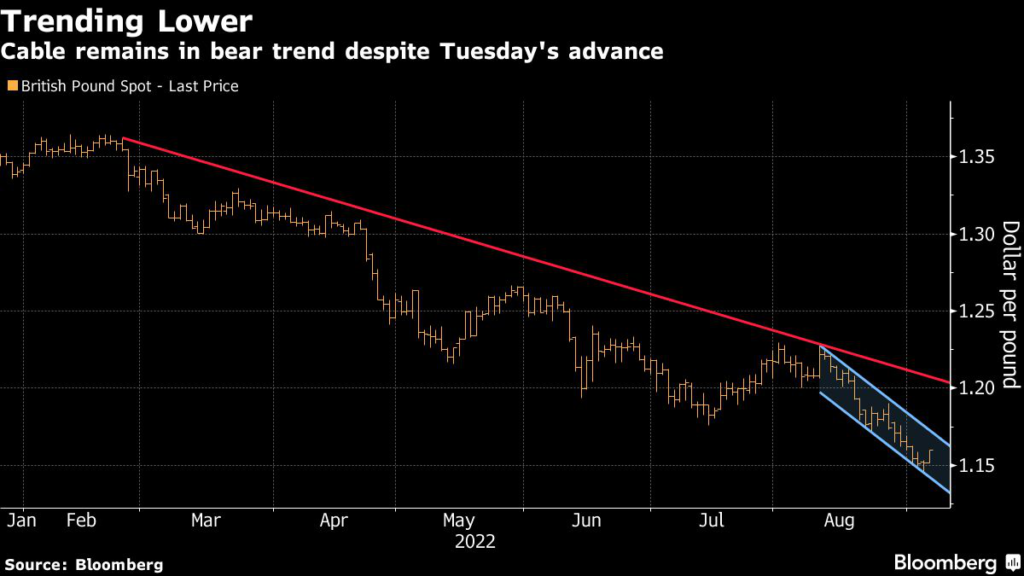 Sterling climbed as much as 0.7% to $1.16 on Tuesday after sliding to the lowest since March 2020 overnight. The rebound was fueled by a report that incoming Prime Minister Liz Truss had drafted plans to avert an energy crisis which risked worsening the UK’s longest economic slump since the financial crisis.