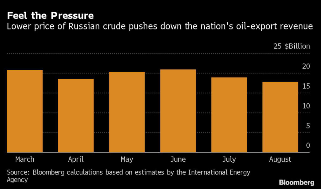 Russia’s oil-export revenue contracted to $17.7 billion in August, the lowest since at least March, as a decline in crude prices more than offset higher supplies abroad, according to the International Energy Agency. That’s a drop of $1.2 billion from a month earlier, even as Russia’s daily crude and oil products exports rose by 220,000 barrels to 7.6 million barrels, the IEA estimated.