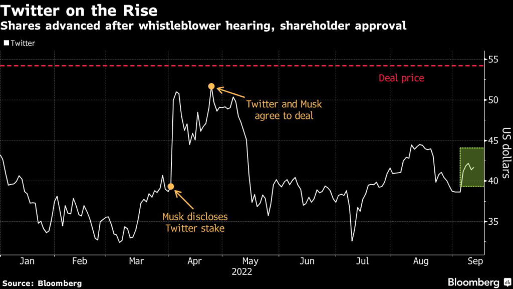 On Tuesday, when US equity markets plunged the most in more than two years, Twitter shareholders voted to approve the merger — and the stock was the second-best performer in the S&P 500, gaining 0.8% to $41.74. While it hasn’t closed above $44.50 since Musk first suggested in May that he might renege, some analysts and investors, including Einhorn, have said the stock would tumble to $20 if the deal falls apart.