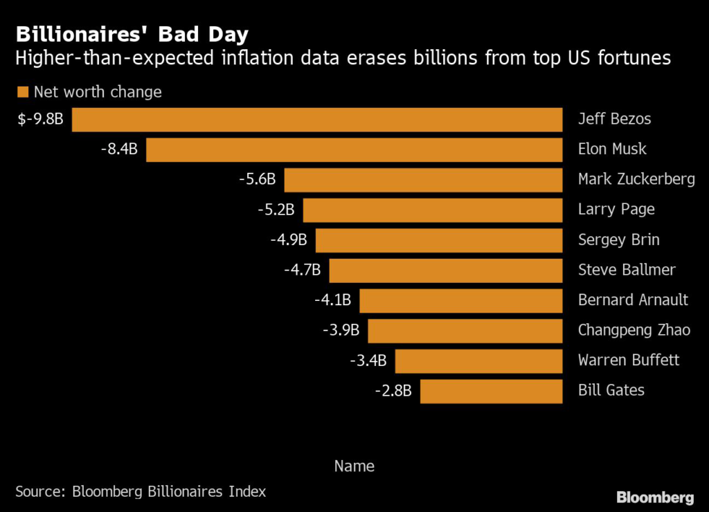 Las grandes pérdidas diarias de los multimillonarios reflejan una liquidación generalizada en el mercado de valores de EE.UU., ya que los inversionistas apuestan a que los datos del índice de precios al consumidor, que fueron más altos de lo esperado, llevarán a la Reserva Federal a aumentar las tasas de interés de manera más agresiva.