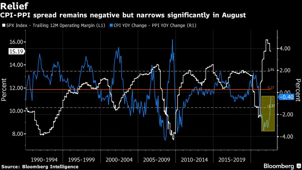 That spread is currently negative, with producer costs rising faster than the prices that companies charge consumers. But it has been narrowing significantly from a steep negative reading of 3.4% a year ago. August’s figure was negative 0.4%, a vast improvement from negative 1.3% in July.