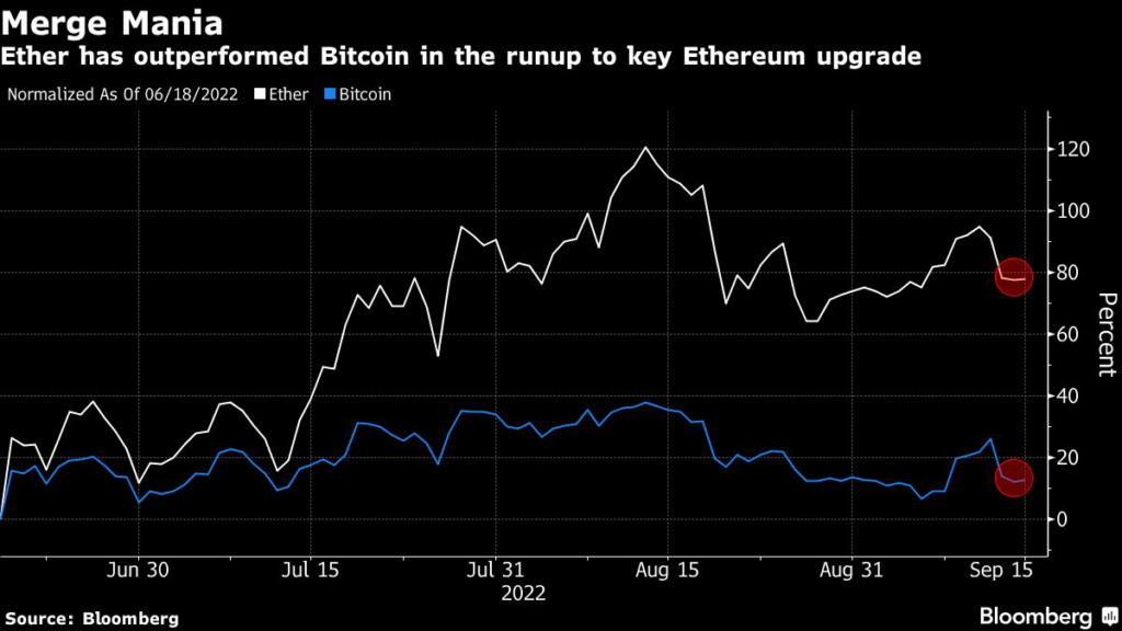 “The market is pricing in a virtually successful Merge to happen,” Teong Hng, co-founder at digital-asset platform Satori Research, said on Bloomberg TV. “For institutional investors, ones who are ESG conscious, they will use this as an opportunity to dip their toes into blockchain, into tokens, into Ethereum.”