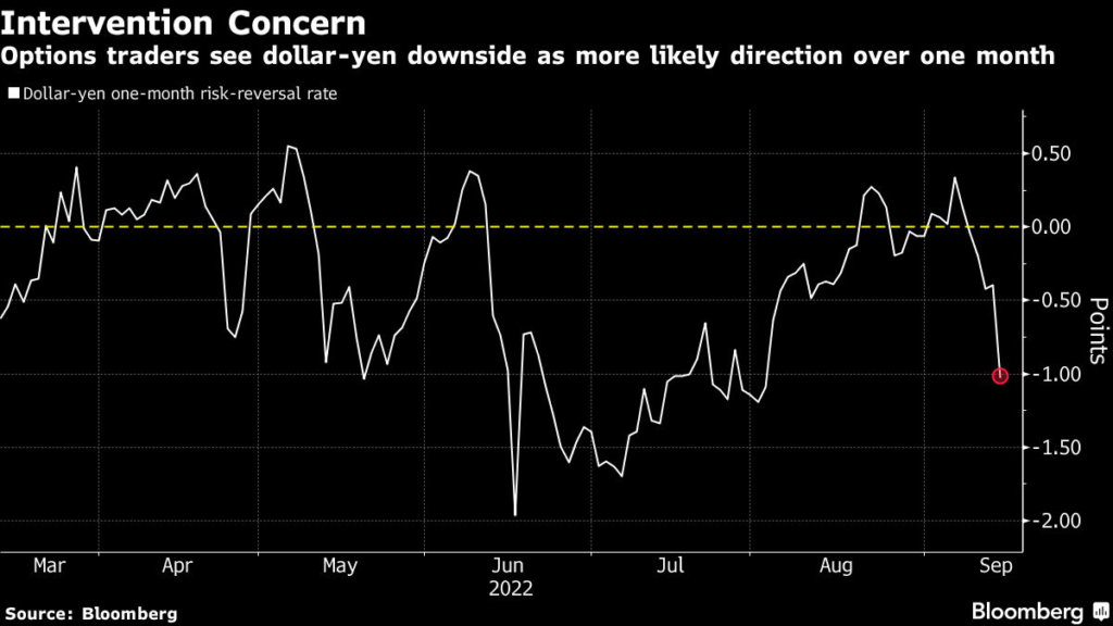 Signals from the options market suggested traders were taking the threat of action seriously. One-month risk-reversals for dollar-yen — a gauge of expected direction for the pair over that time frame — fell to the lowest in since early August.
